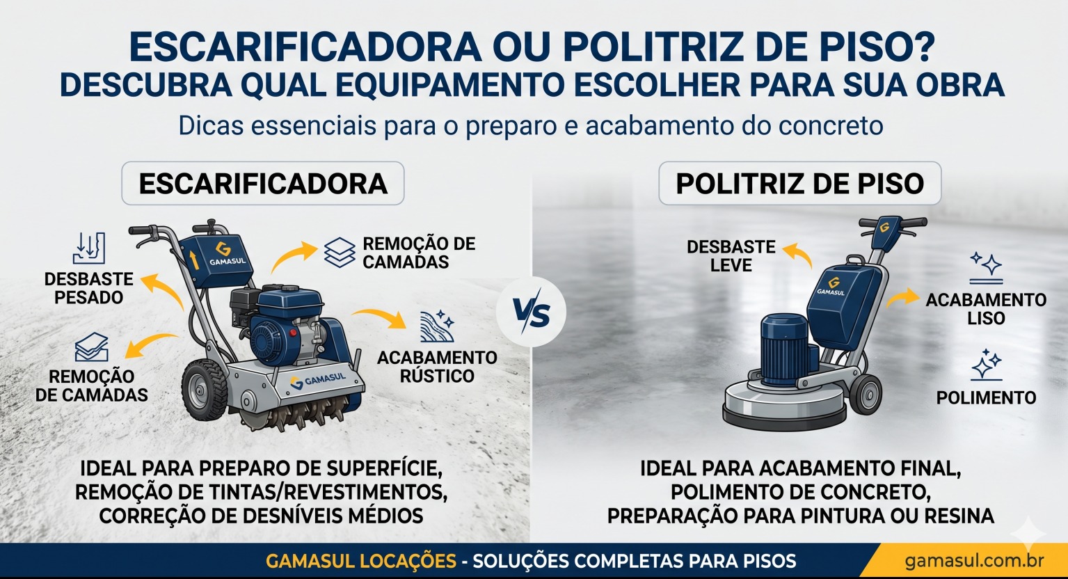 A Gamasul Locações oferece equipamentos ideais para cada etapa da obra, desde o desbaste até o polimento final.